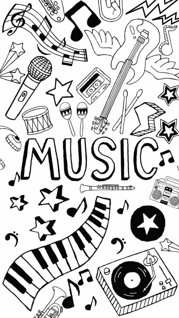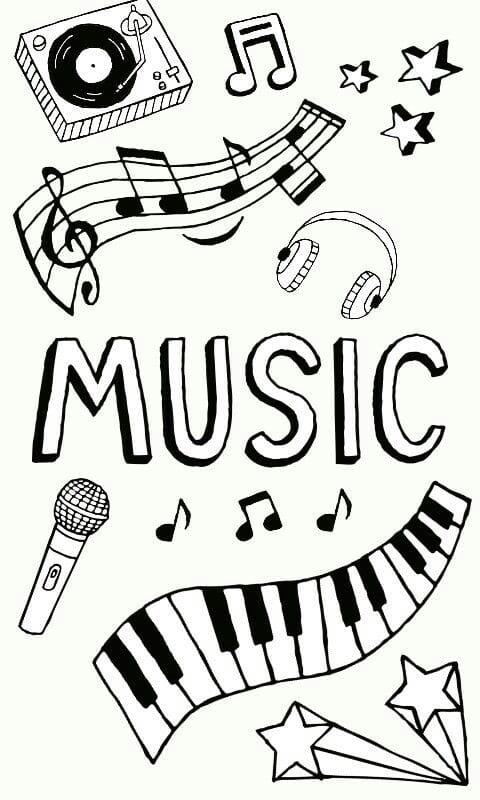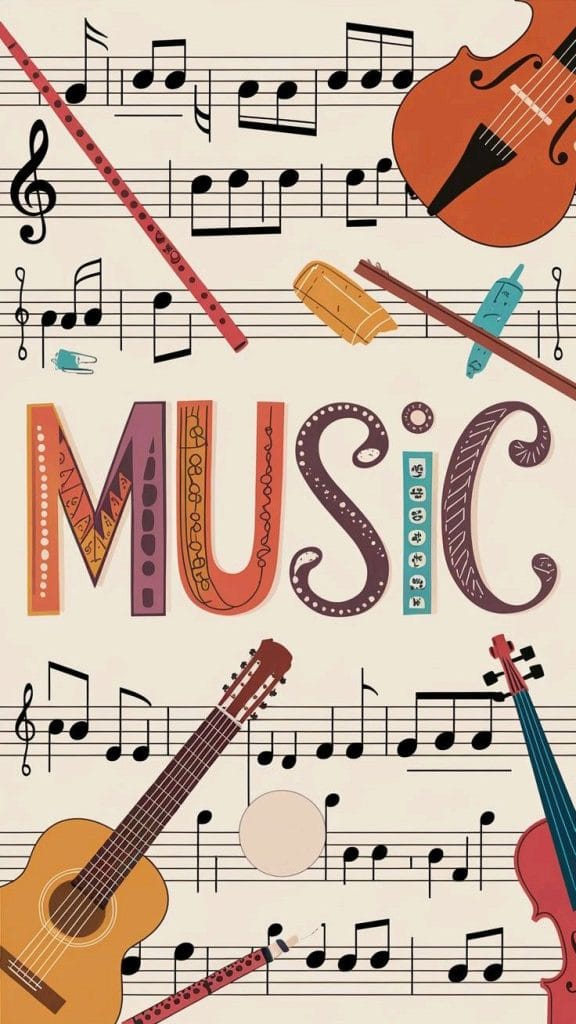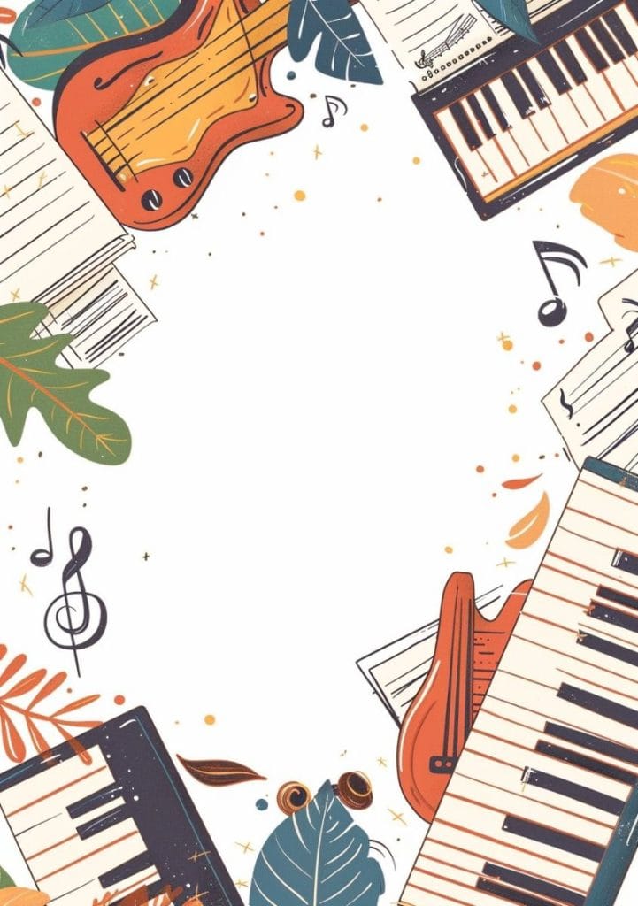 - Illustrations ou symboles musicaux : notes de musique, instruments (guitare, piano, violon, tambour), partitions, micro, casque audio, etc.