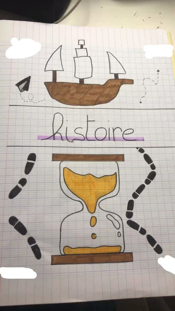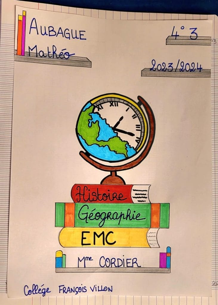 Page de garde créative : division en sections avec couleurs, photos ou dessins liés au thème étudié.